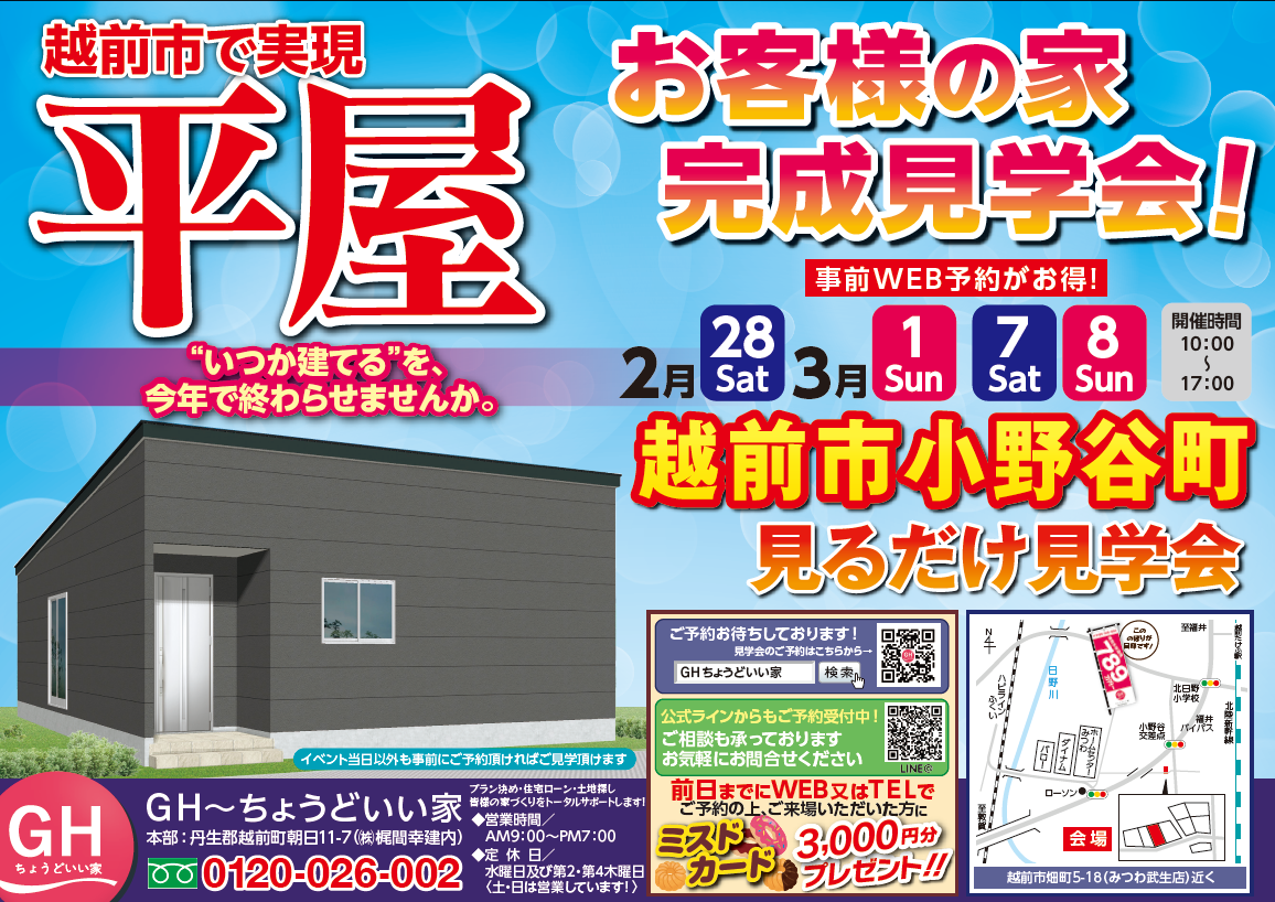 【2月28日(土)~3月8日(日)】越前市小野谷町にてお客様のお家完成見学会開催!