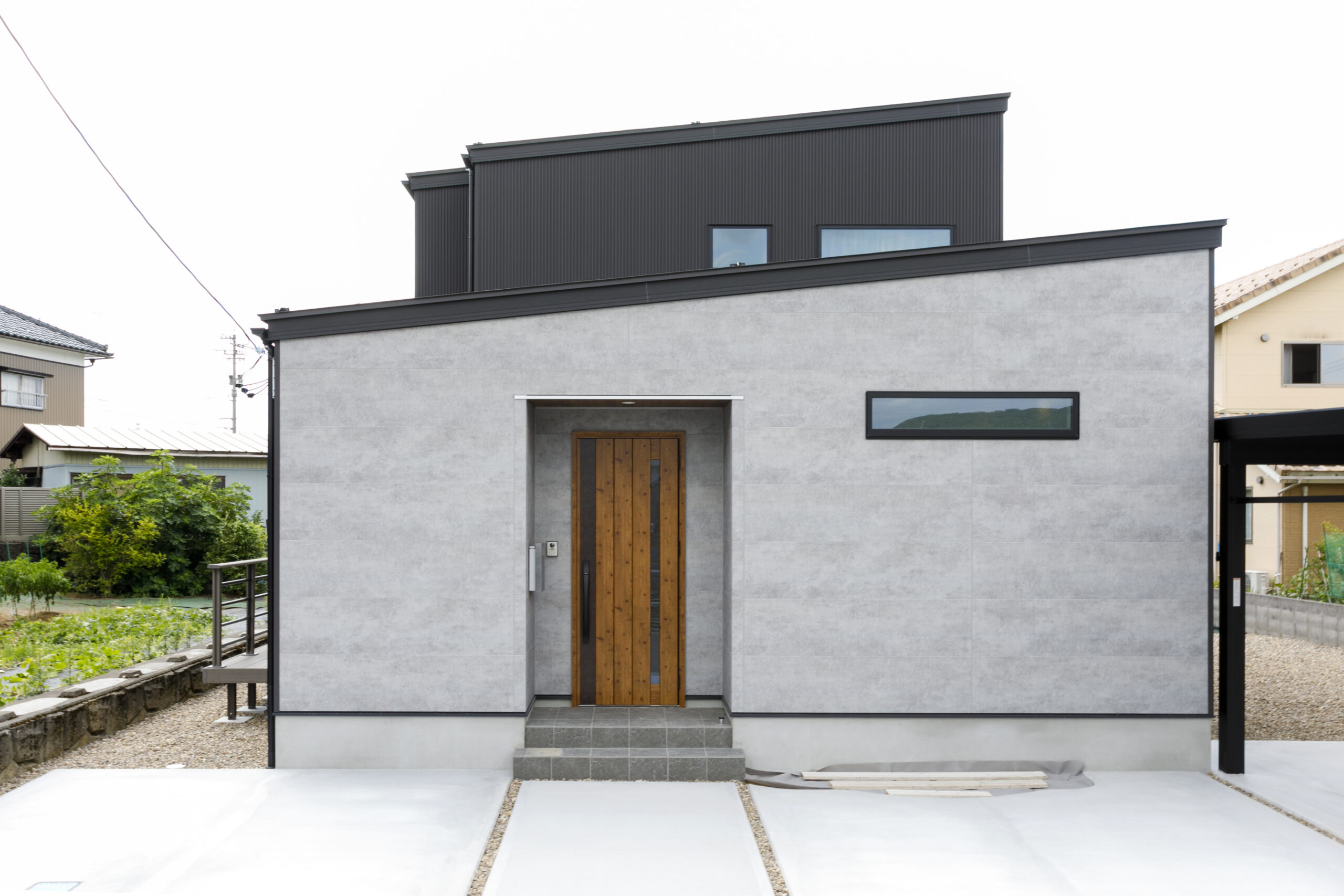 ブラックのガルバリウム鋼板に、アクセントとしてモルタル調のサイディングを合わせました。